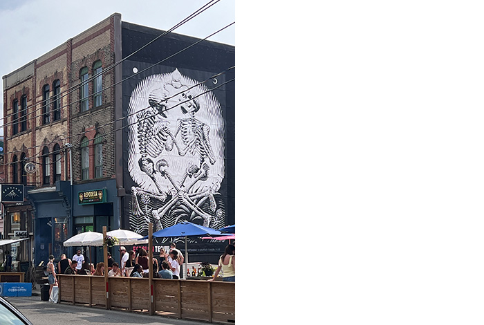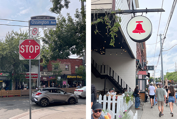 クイーン・ストリート・ウエストを東へ少し歩くと、オシントン・アベニューに突き当たります。クイーン・ストリートとダンダス・ストリートに挟まれたこの通りには、レストランやバー、小さなギャラリーが点在し、魅力的なスポットが次々と現れます。夜は活気にあふれ、午後のゆったりとした時間を過ごすのにもいいかもしれません。私たちのお店を訪れる前や後に、足を止めて道行く人々を眺めたり、軽く食事をとったりするのにもぴったりの場所です。